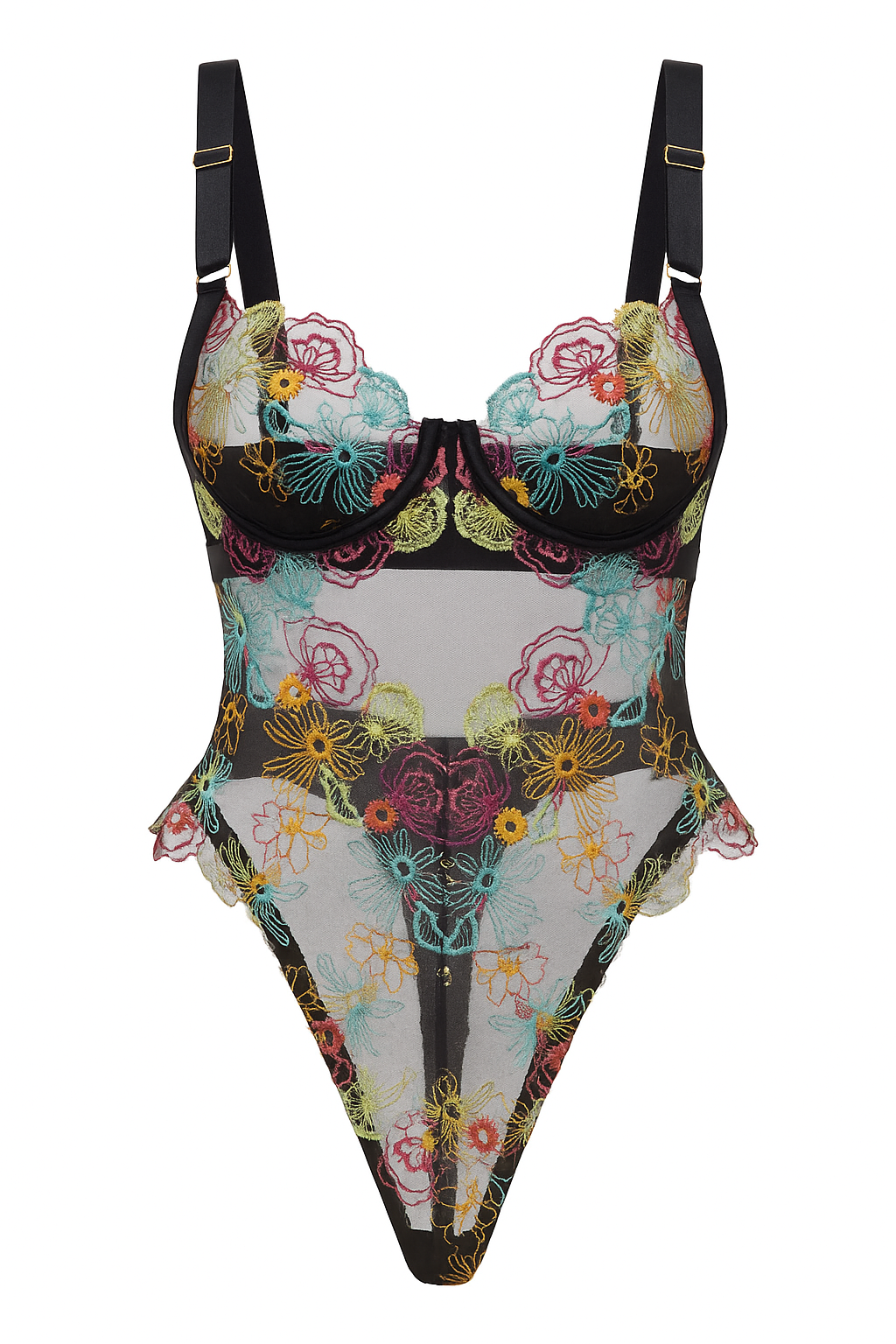 This stunning piece features multicolor floral embroidery on soft sheer polyester lace, creating a striking contrast against the dark mesh. The sculpted bust and high-leg design enhance your silhouette, while adjustable straps allow for a customized, comfortable fit.